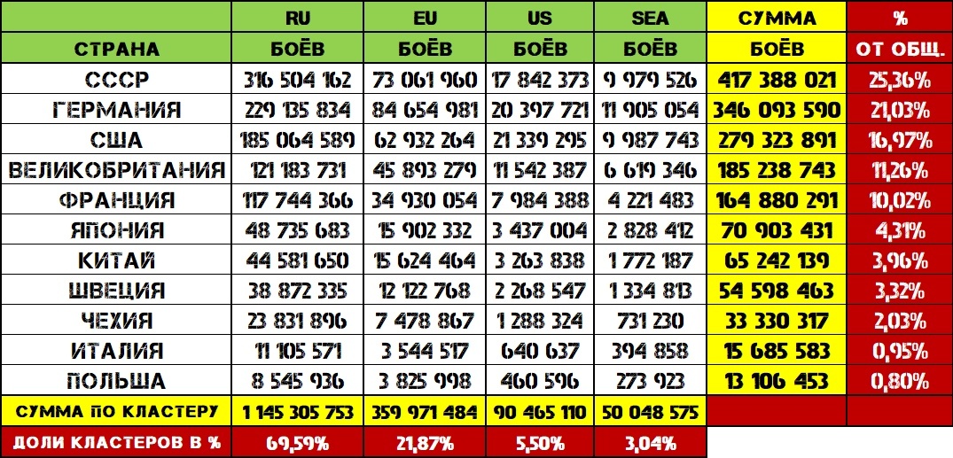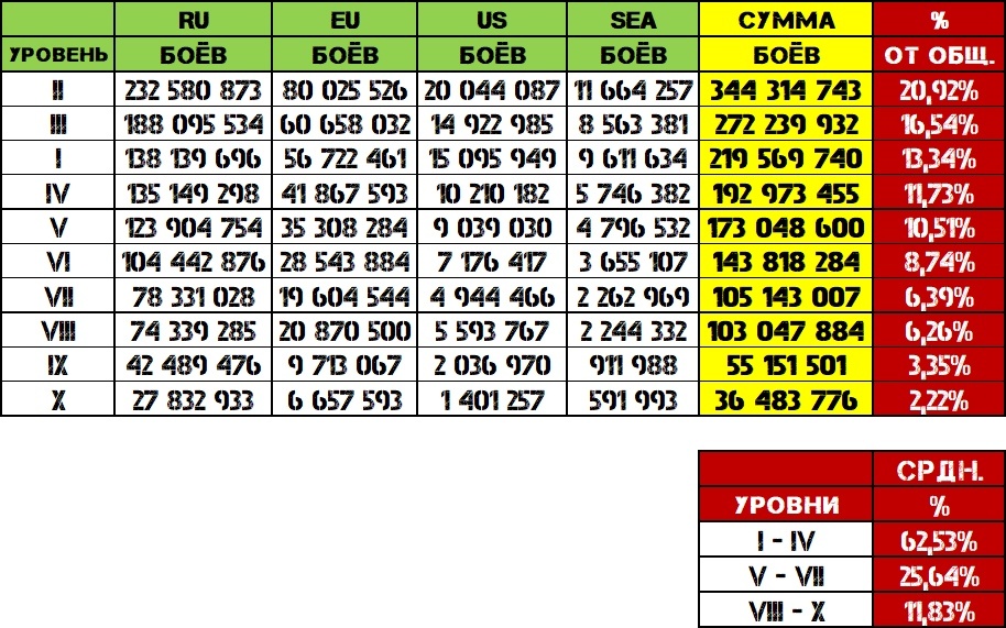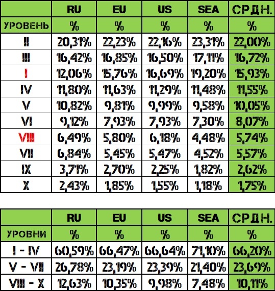 …má však cenné údaje. Jestliže vás ale přestane bavit, klidně tento článek odložte, nic, co by bylo pro vaše hraní důležité, v něm nenajdete. Pokud ve vás ale tabulky, srovnání a z toho plynoucí poznatky vzbudí zájem, pár jich tu mám a zkusím přiblížit, o co v nich jde. Přebíráme je od ruskojazyčných kolegů, kteří dali dohromady údaje za týden provozu všech serverů ve všech regionech.