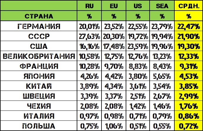 V tabulce shora podle celkové oblíbenosti (údaj ve žluté části tabulky) : Německo, Sovětský svaz, USA, Velká Británie, Francie, Japonsko, Čína, Švédsko, Československo, Itálie, Polsko.
