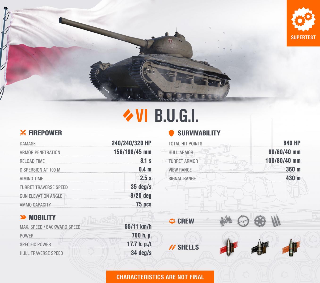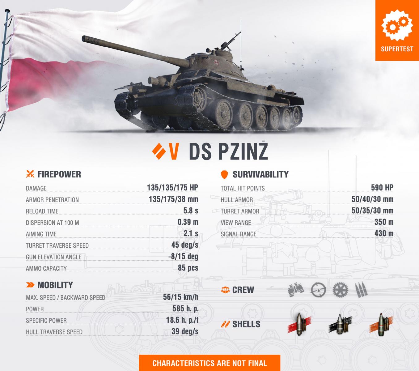Nejnovější (ovšem ne topová) tři vozidla z nové větve polských středních tanků míří na Supertest: DS PZInż (V. úroveň), B.U.G.I. (VI. úroveň, ovšem se jménem, jež by se hodilo i pro tank X. úrovně, který je dostatečně šik) a CS-44 (VII. úroveň).