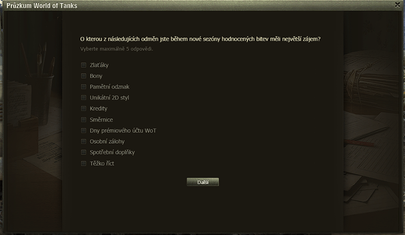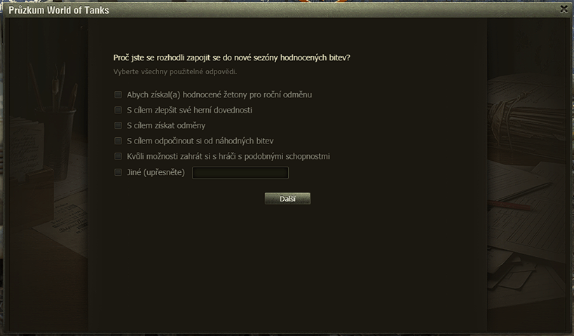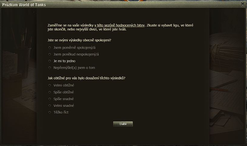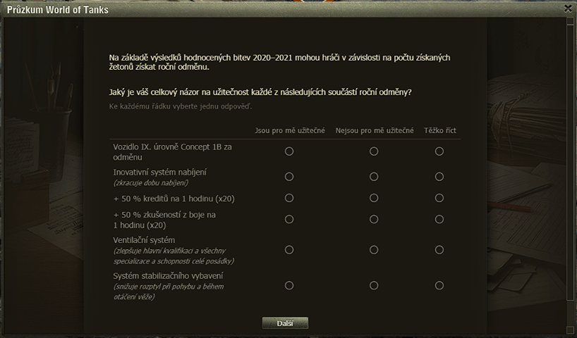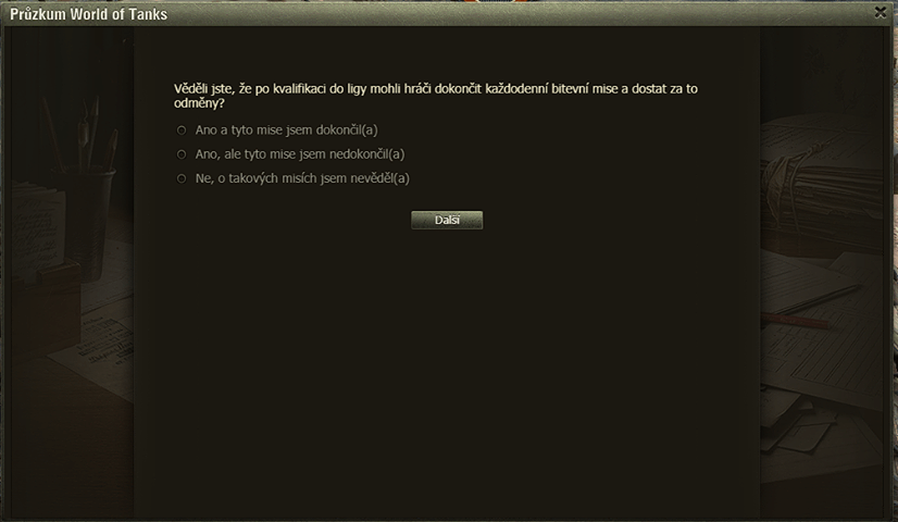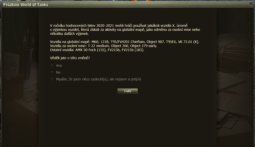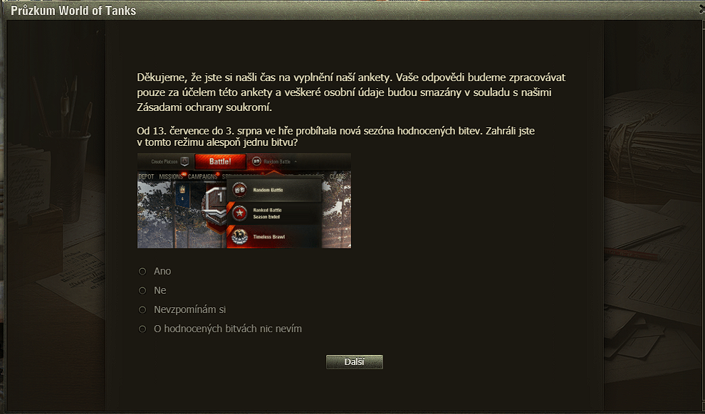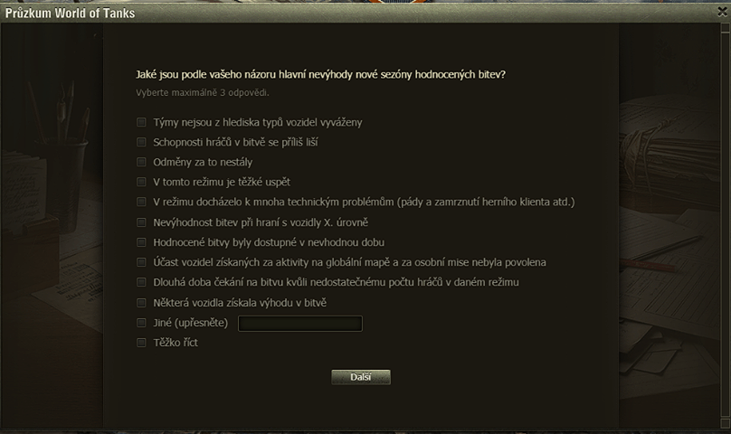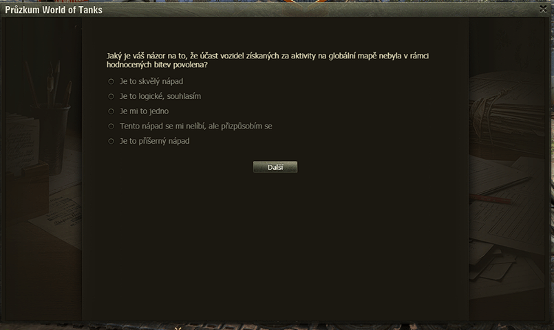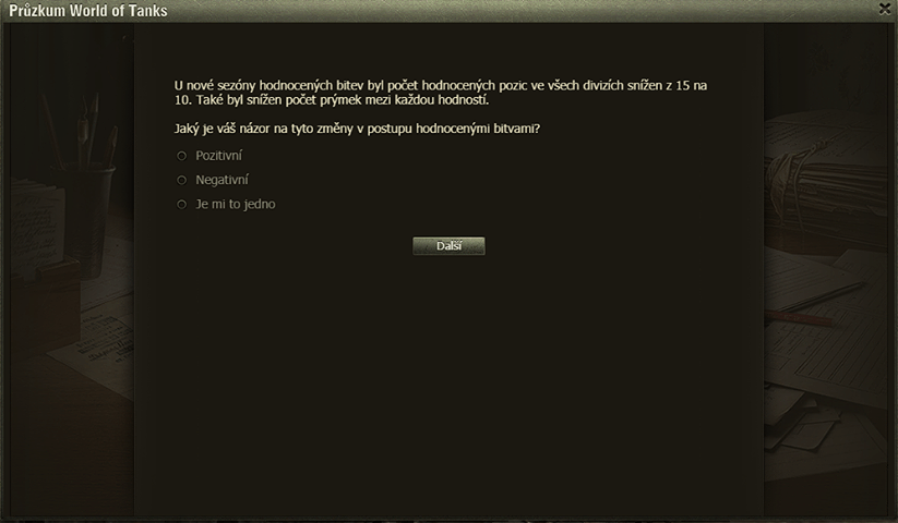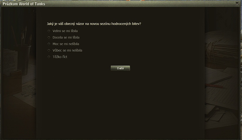 Když už dnes plísním, tak ještě trochu přidám. Čas od času se ve hře objeví dotazník na věci týkající se WoT. Byl po SB, a přesto, že jsem se aktivně účastnil, tak dotazník nedorazil. Teď nám skončily RB a zase jsem se účastnil, odjel jsem základní část a trochu potom a stejně jsem zase žádný nedostal. Ale abych nebyl takový negativista, jeden jsem dostal. Ptali se mne, kolik je mi let a jaké je moje vzdělání. Radši bych dostal ty předchozí dva než tenhle.
