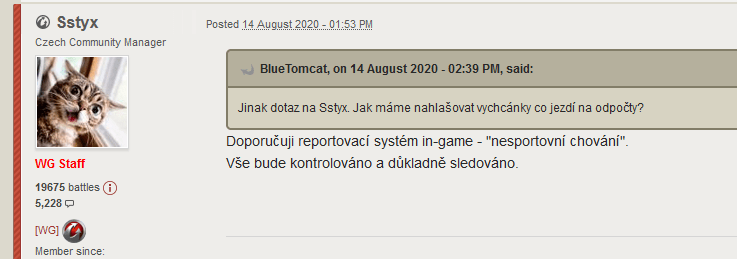 A jak to celé dopadlo? Ježik WOT byl z turnaje a eventu následně diskvalifikován. Hráči, kteří v turnaji skončili pod ním, se posunuli o příčku výše. Ježikův účet dostal ban na 7 dní za porušení pravidel hry. Dvanáct účtů používaných k tomuto podvádění dostalo ban permanentní. Jestli to je zasloužený trest pro podvodníka, nebo zakrývání chyb WG a snaha umlčet protesty, nechám na vašem posouzení. Každopádně pro nás z toho plyne trochu hořký závěr. Ten, který (možná) chtěl na problém upozornit, byl potrestán, a to nejen ve hře, ale i ztrátou důvěry některých svých diváků. Replaye se z Ocelového Lovce ani po takové aféře ukládat nebudou. Pokud si záznam pořídíte vlastními prostředky, WarGaming ho nebude uznávat jako důkaz. Takže nám bylo v podstatě řečeno že si ilegální teaming musíme nechat líbit.