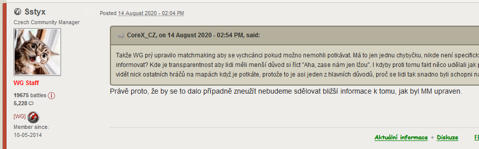 Vyšla zpráva, že youtuber Ježik WOT má na krku žalobu od WG a je mu zablokován na jeho youtube kanálu veškerý obsah týkající se hry a WG od zveřejnění jeho prohlášení. Někteří RU youtubeři upozorňují na porušení svobody slova a fair-use principů youtube. Kauzu budeme dál sledovat.