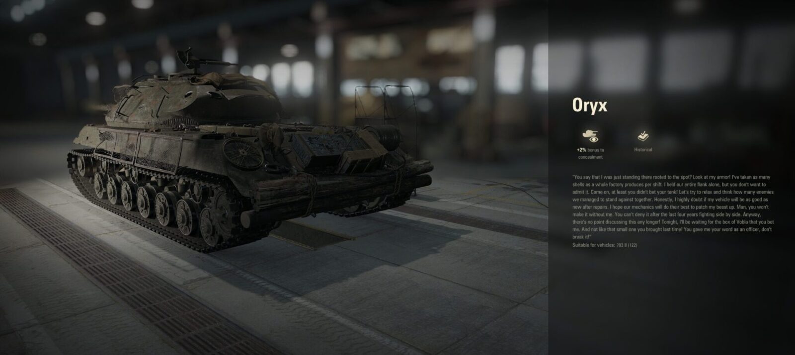 Tento velice pěkný, střízlivý a uvěřitelný 3D styl je určen pro Objekt 703 variant II – sovětský premiový dvoudělový těžký tank na VIII tieru. Počítá se mezi styly historické, s technickou cenou 2.500 goldů. Má zajímavý název „Oryx“, jehož původ se nám nepodařilo dopátrat – prozatím. Provází jej text, který se pokusíme zhruba přeložit: