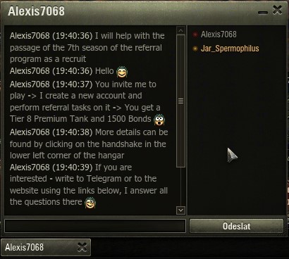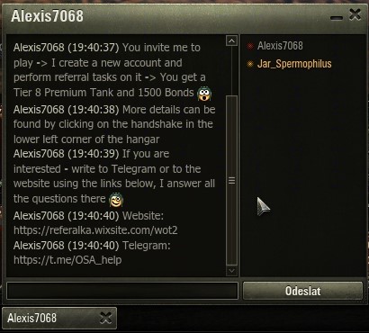 Tentokráte se jedná o nabídku související s Rekruty. Dostanete zprávu, kde se dotyčný nabízí, že s vámi bude jezdit rekruta, ve zprávě je odkaz, jenž však vede kdovíkam. Je pravděpodobné, že ona stránka bude chtít vaše přihlašovací údaje, které však mohou být zneužity k odcizení vašeho účtu. Neklikejte a neotevírejte žádné odkazy, jimiž si nejste jisti. Nejde jen o World of tanks, ale o jakékoli nevyžádané odkazy, které dostanete. Můžete přijít nejen o peníze. Ostatně podívejte se na aktuální zprávu sami: