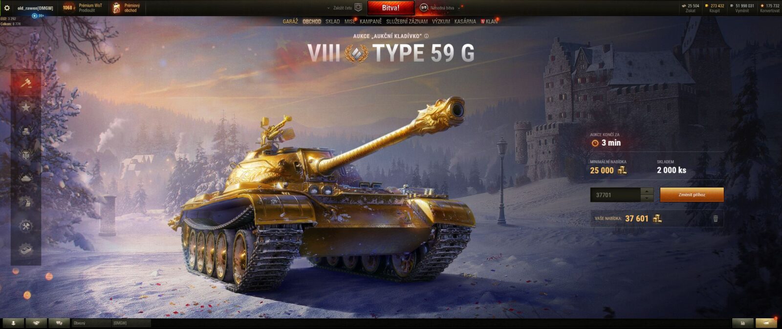 Jen pro zajímavost pohled do jiného regionu: Průměrná sázka na získání Type59G na ASIA serveru (připomínám že tam má +100% zisku kreditů, ne jen +50% jako u nás) byla přes 105.000 goldů, maximální 330.000 goldů. Dražilo se 2.000 tanků. Naposledy tam byl normálně ke koupi v premium shopu před rokem, cena v juanech tehdy odpovídala přibližně 27.000 goldům. Minimální sázka na získání WaffenTragera, který na ASIA serveru nahradil WZ Beijing Opera, byla 72,500 goldů.