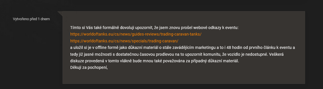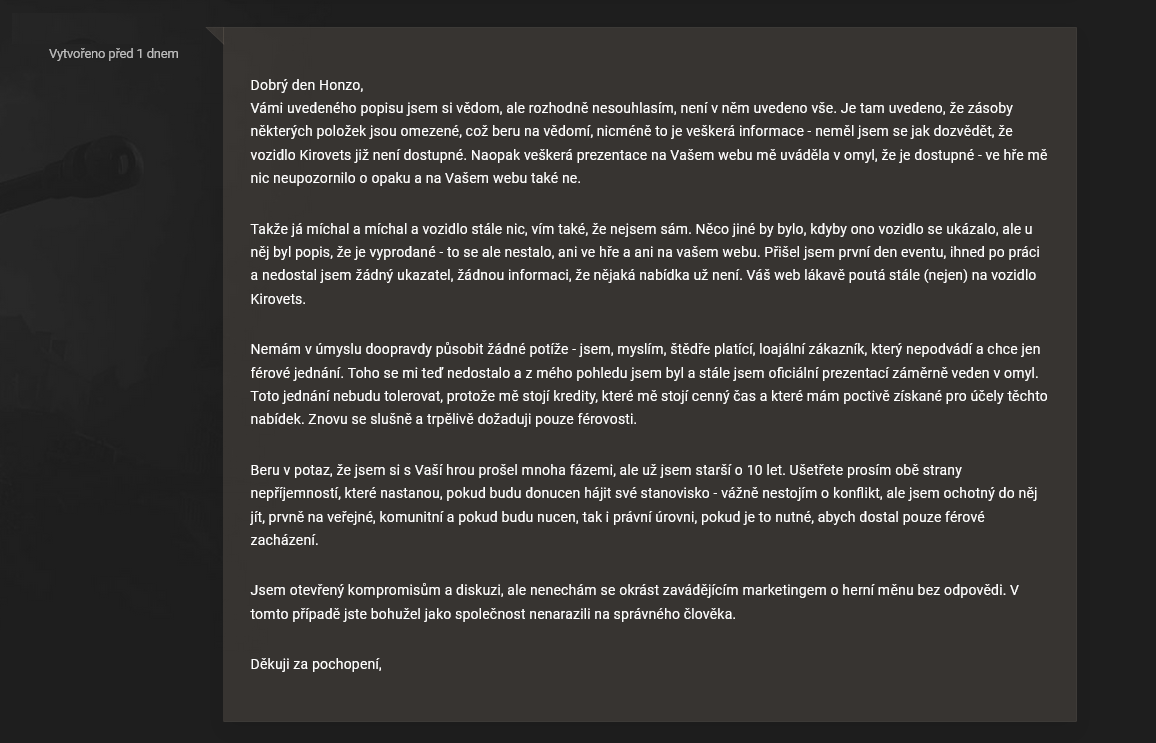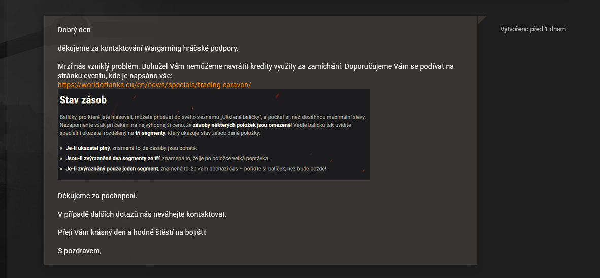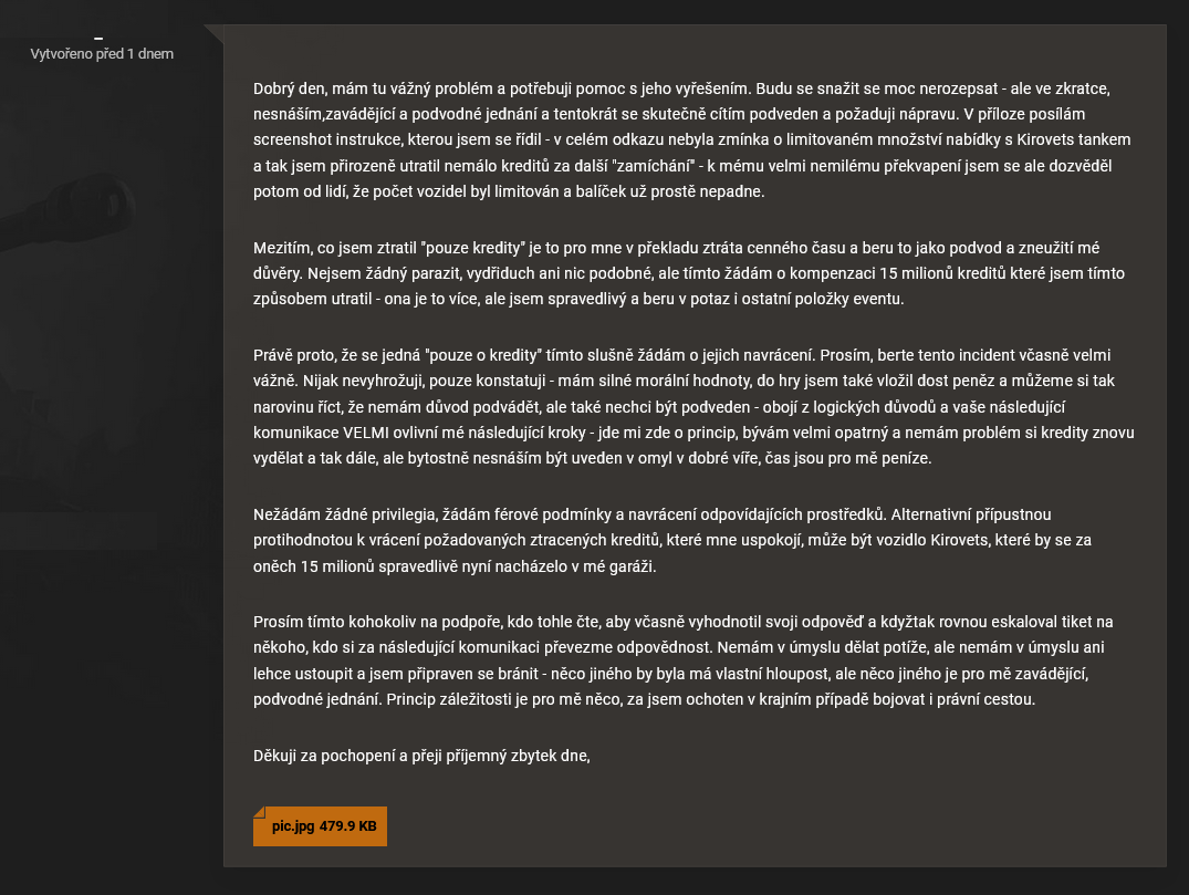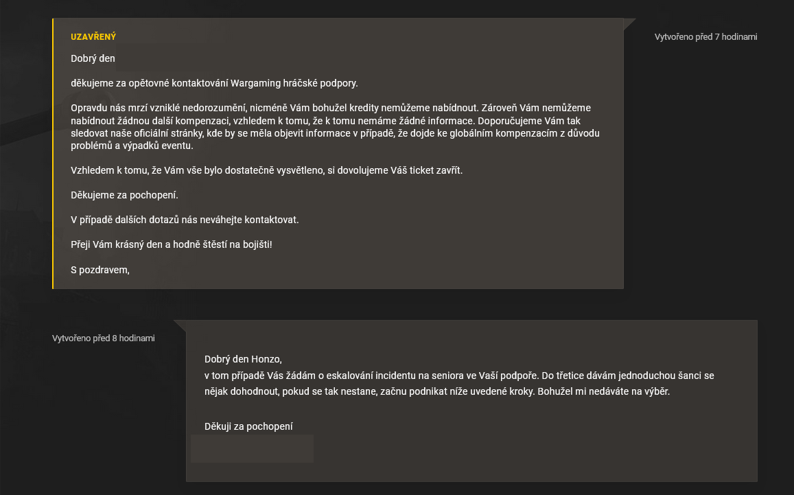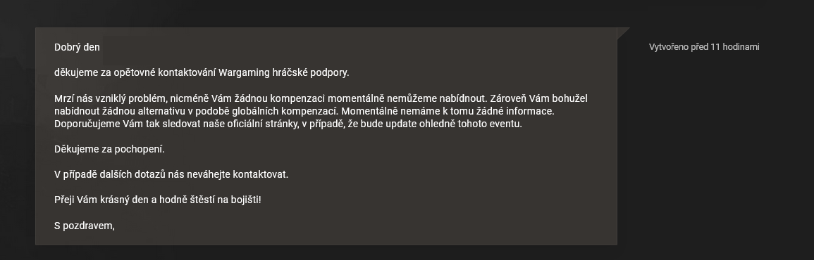 Hráč (zachováváme jeho anonymitu) měl narozdíl – například ode mě – to pomyslné štěstí, že mu event alespoň fungoval. Já osobně jsem z eventu viděl jediné – to, co je v úvodním obrázku. Jak je ale podle zdokumentované komunikace s herní podporou vidět, je na zvážení, kdo z nás dvou z eventu nakonec vyšel lépe. Já alespoň zbytečně nepřišel o miliony kreditů.