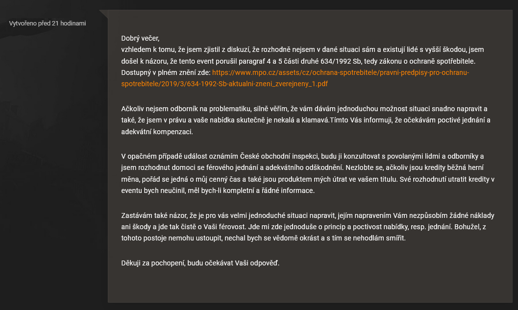 Ne každý si nechá takové věci líbit, klamavá reklama je jeden z mírnějších termínů, s nimiž jsem se v debatách o eventu setkal. Někteří použili i silnější slova jako „podvod“ a podobně. A hráč, který nás kontaktoval, neváhal oslovit herní podporu a začít situaci řešit s nimi. Jak celá komunikace probíhala a jak úspěšný byl v žádosti o kompenzaci za nefér vylákané kredity, můžete vidět v galerii. Pokud je mi známo, pokračuje v komunikaci dál a nemíní se nechat jen tak odbýt. Uvidíme, kam se tato kauza bude dále vyvíjet, má naši plnou pozornost a budeme vás informovat. A jak jste s eventem dopadli vy? Fungoval vám? Ukořistili to, co jste chtěli? Nebo jste také viděli jen některou chybovou hlášku, případně zbytečně přišli o miliony kreditů? Komentáře jsou vám k dispozici.