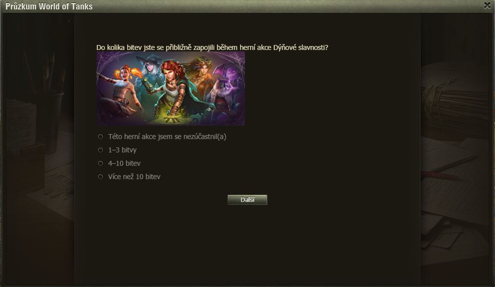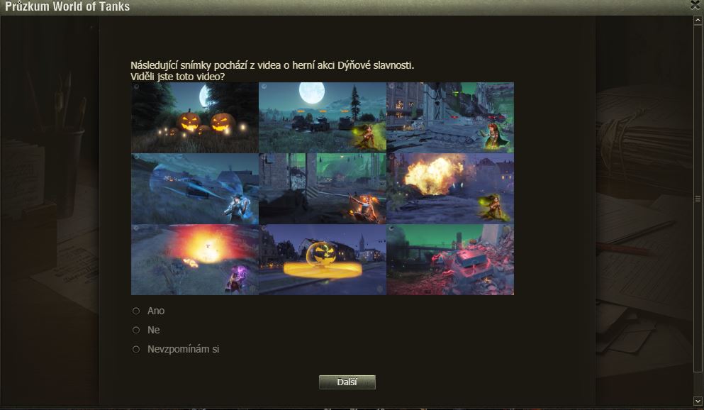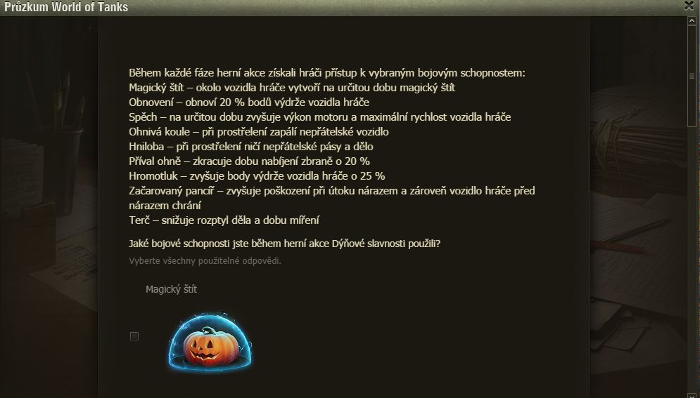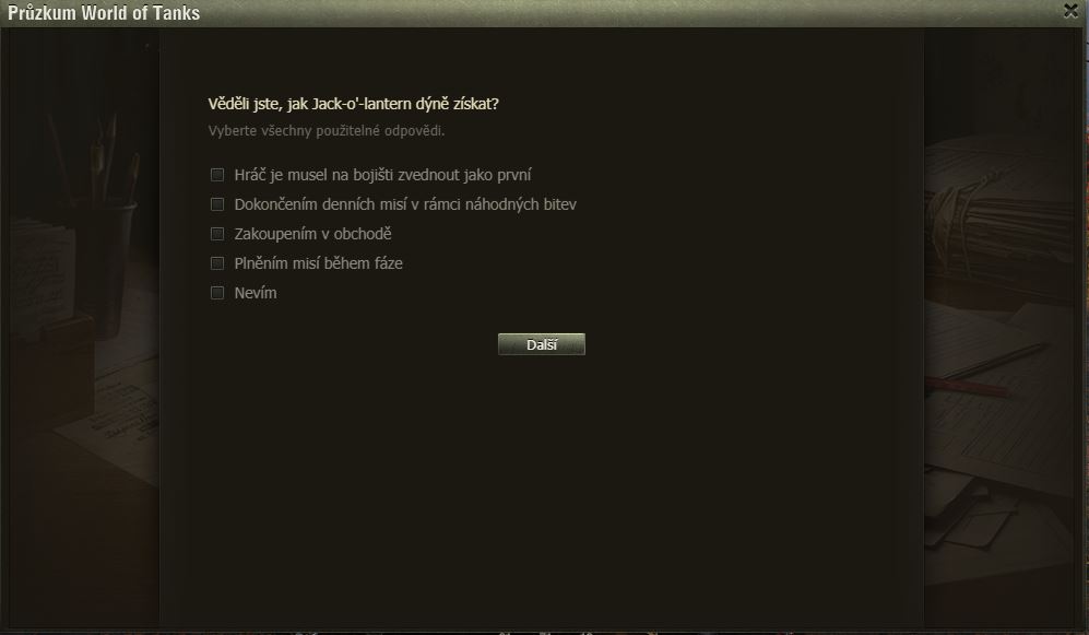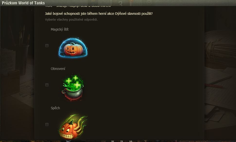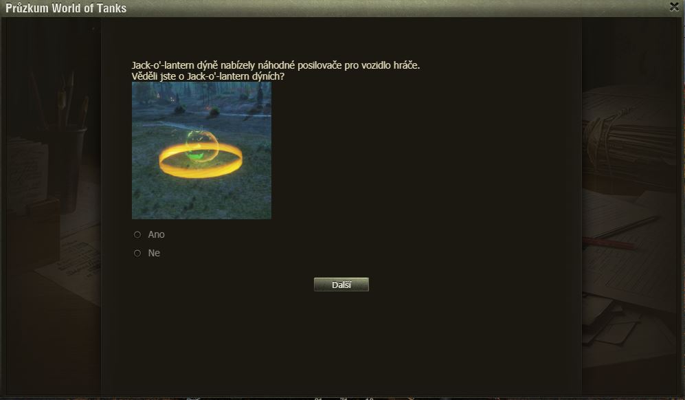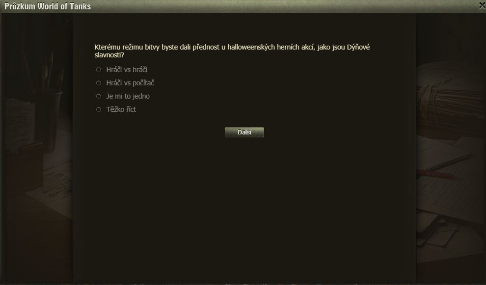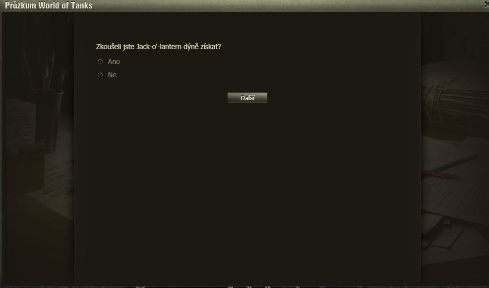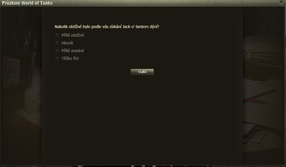 Hráli jste Dýňové slavnosti? Pak možná uvítáte dotazník WoT právě na tuto akci. Po delší době se mi ve hře objevilo okno dotazníku, poctivě jsem ho vyplnil a odeslal.