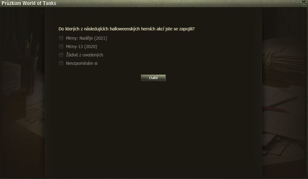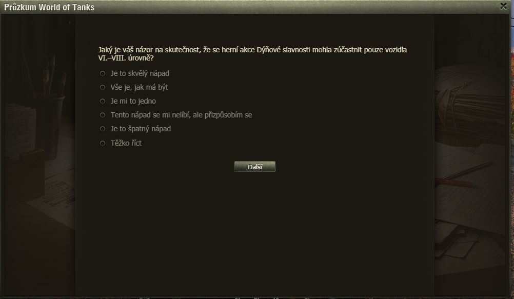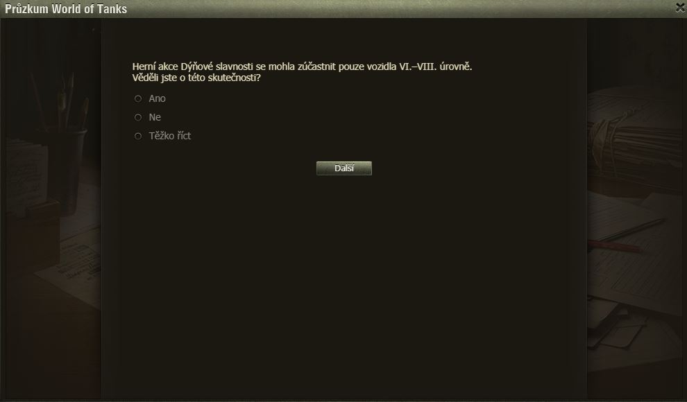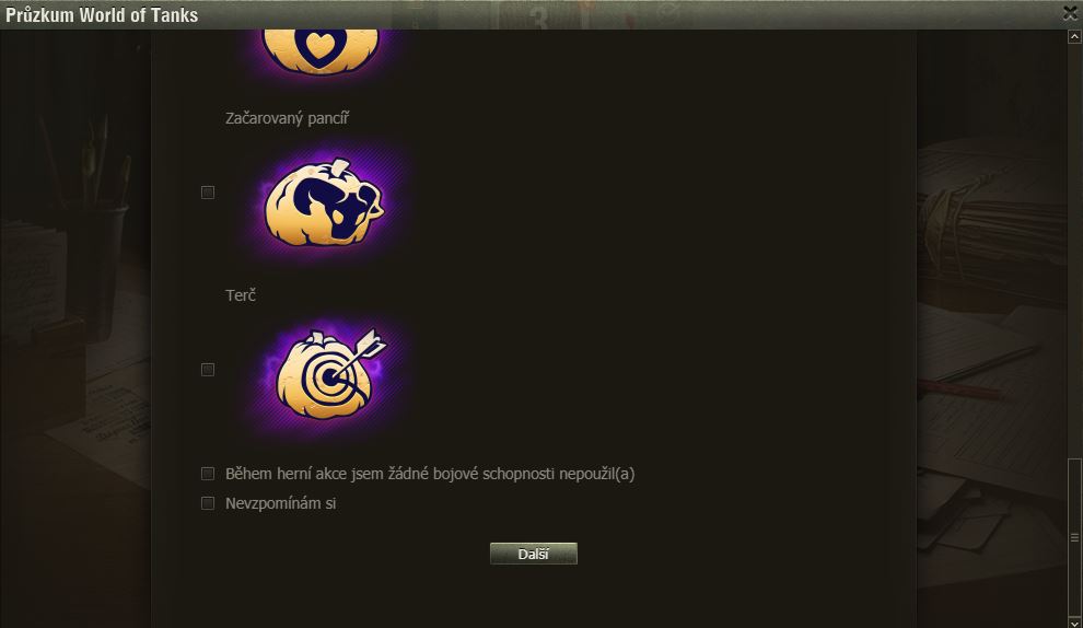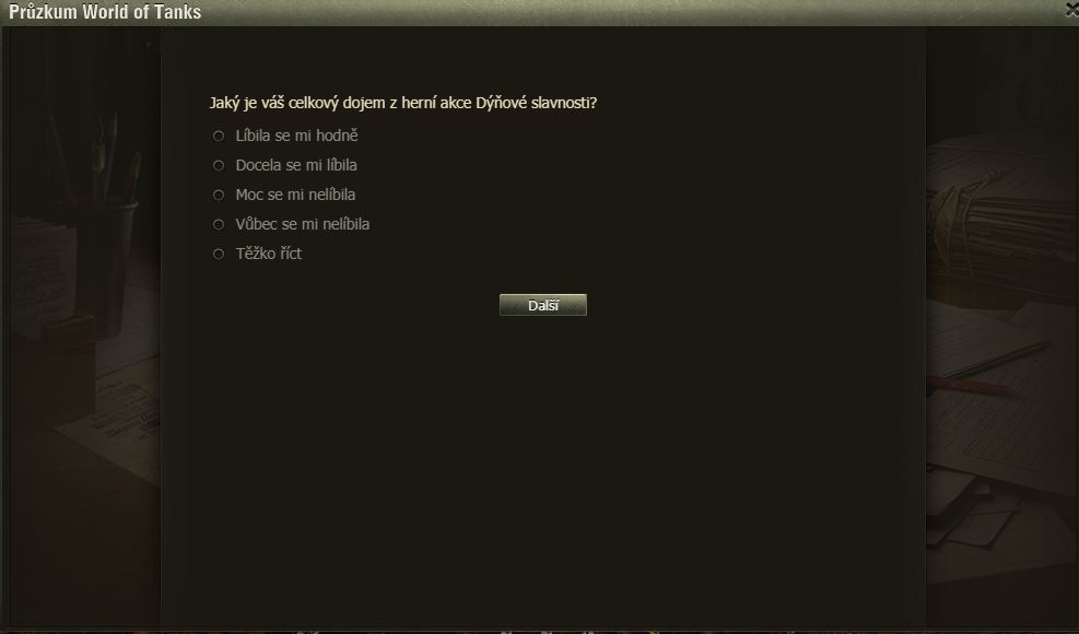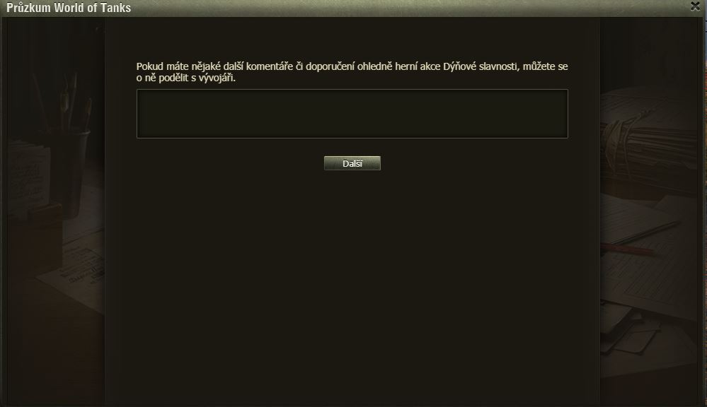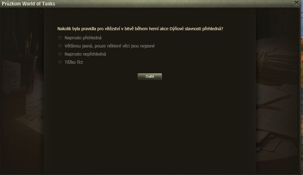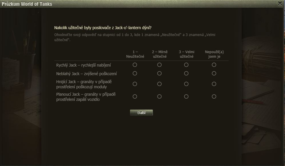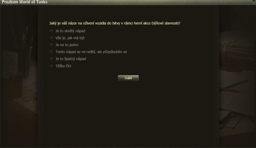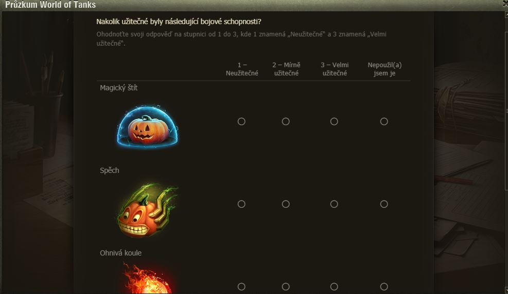 Hráli jste Dýňové slavnosti? Pak možná uvítáte dotazník WoT právě na tuto akci. Po delší době se mi ve hře objevilo okno dotazníku, poctivě jsem ho vyplnil a odeslal.