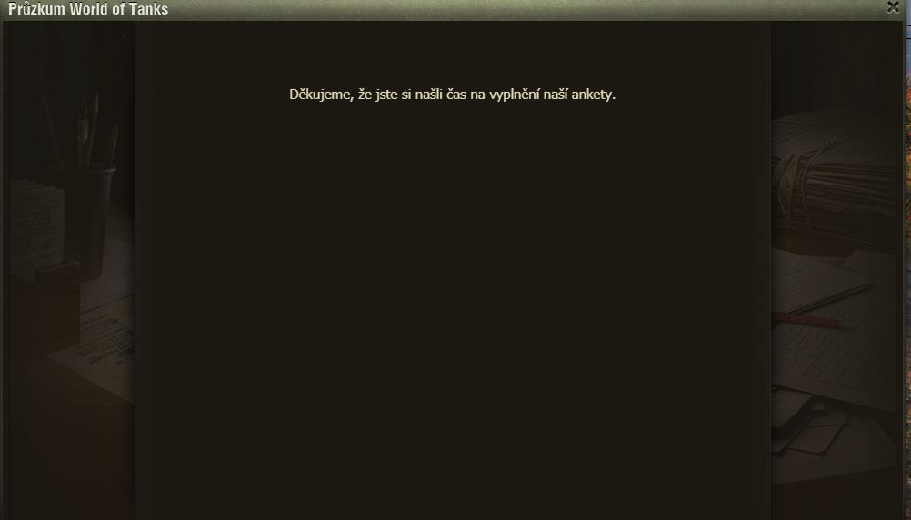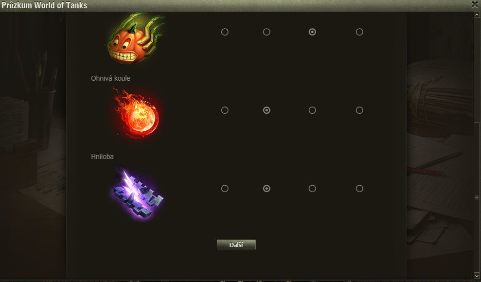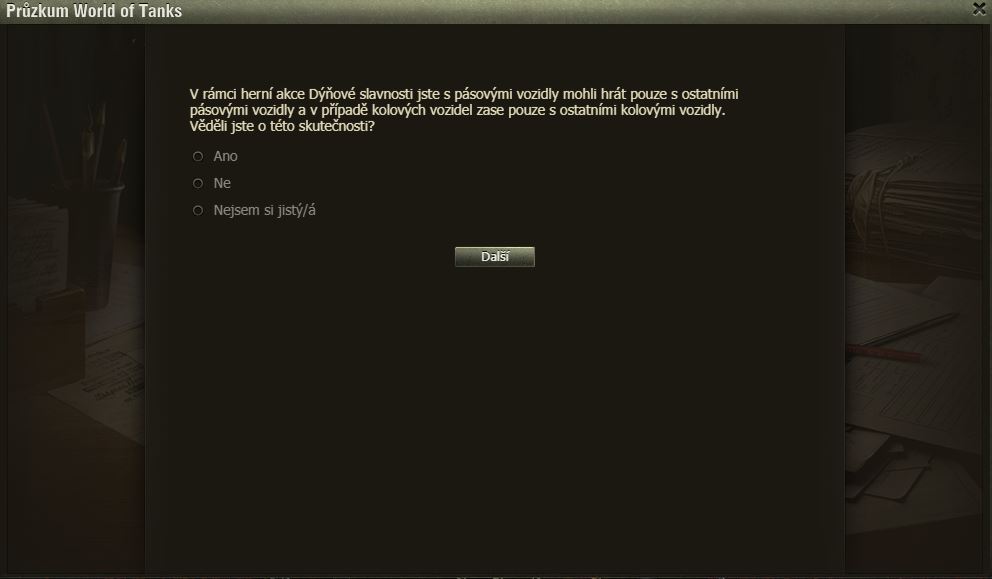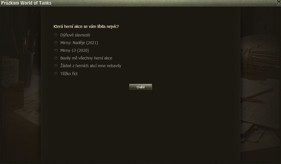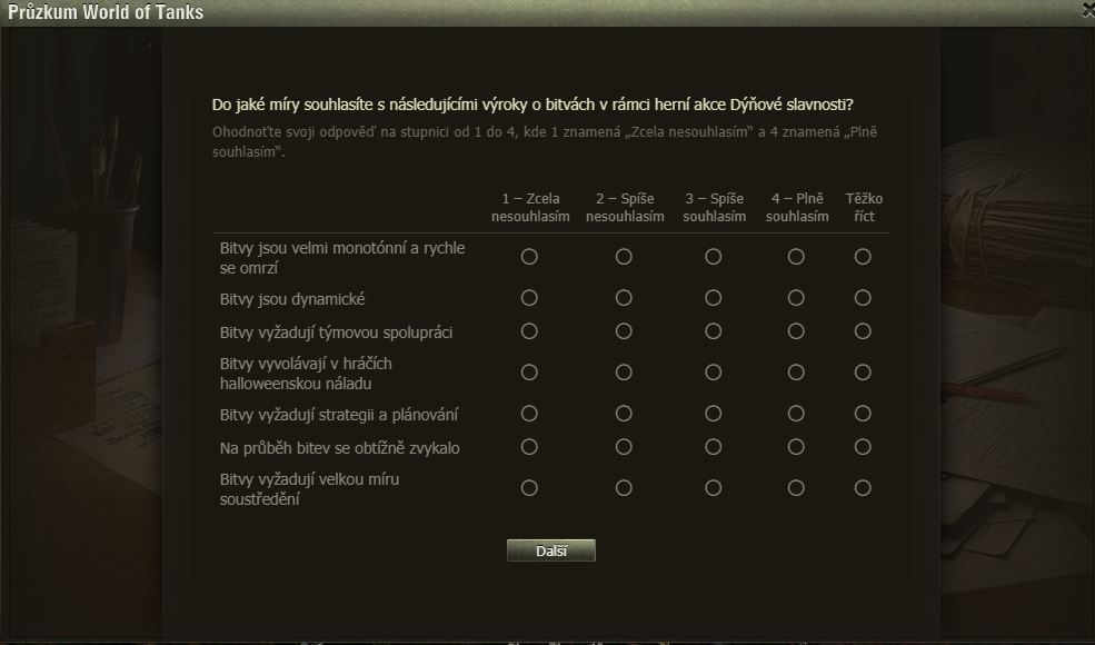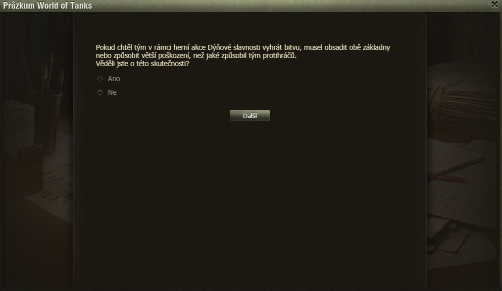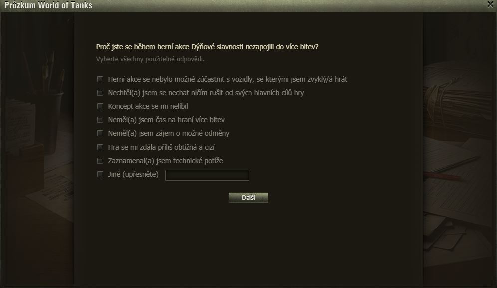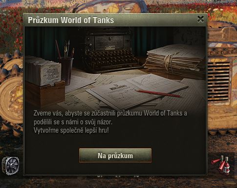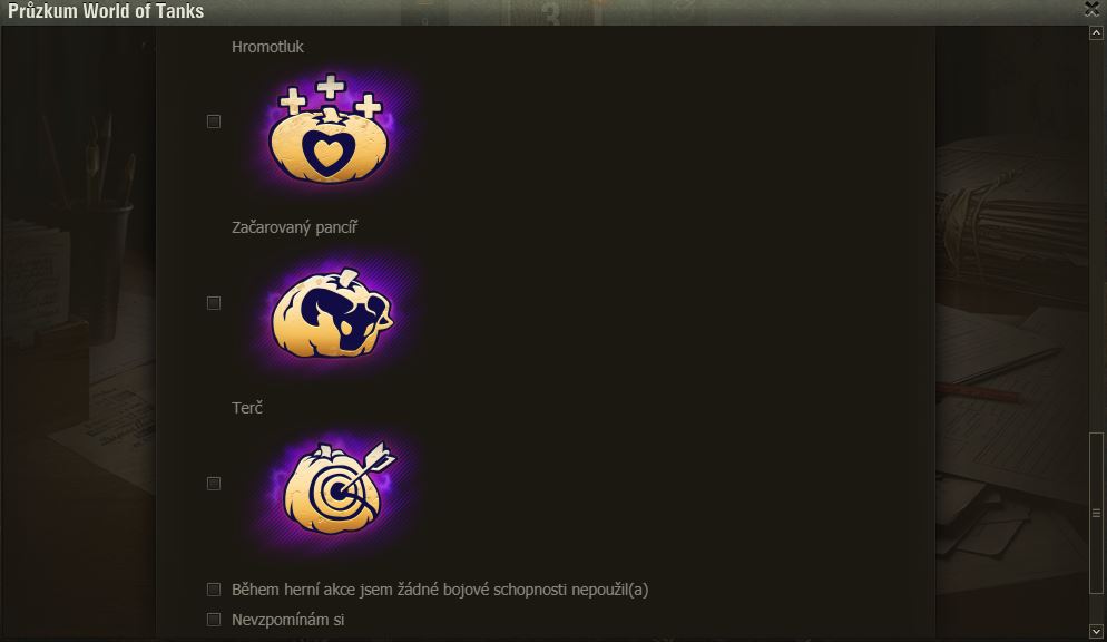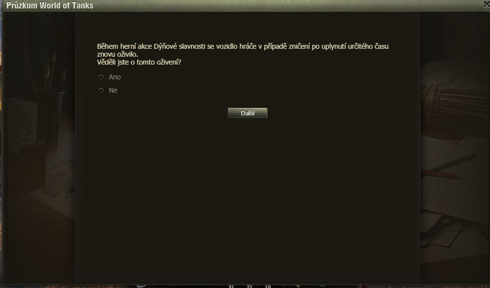 Hráli jste Dýňové slavnosti? Pak možná uvítáte dotazník WoT právě na tuto akci. Po delší době se mi ve hře objevilo okno dotazníku, poctivě jsem ho vyplnil a odeslal.