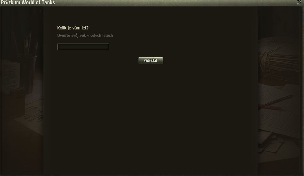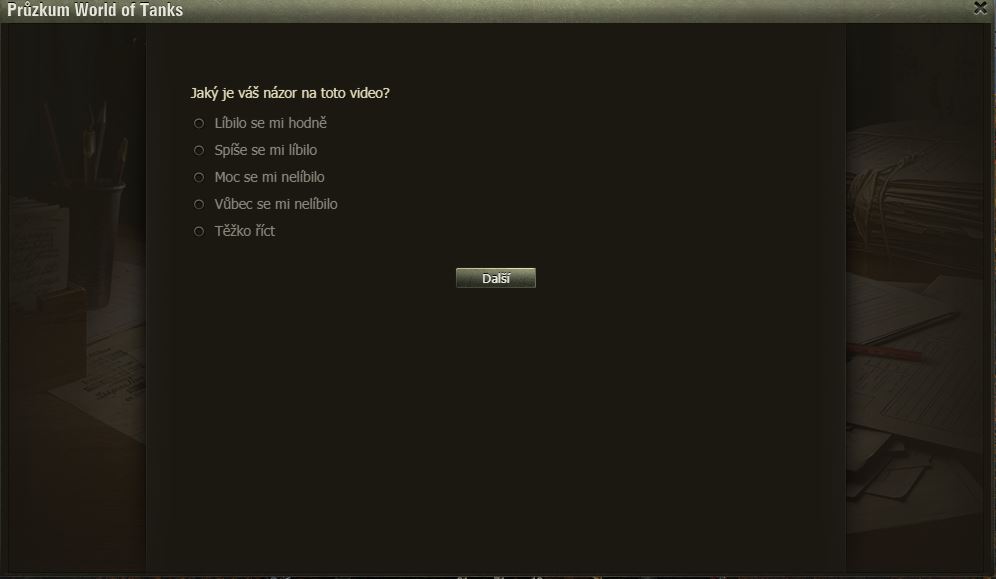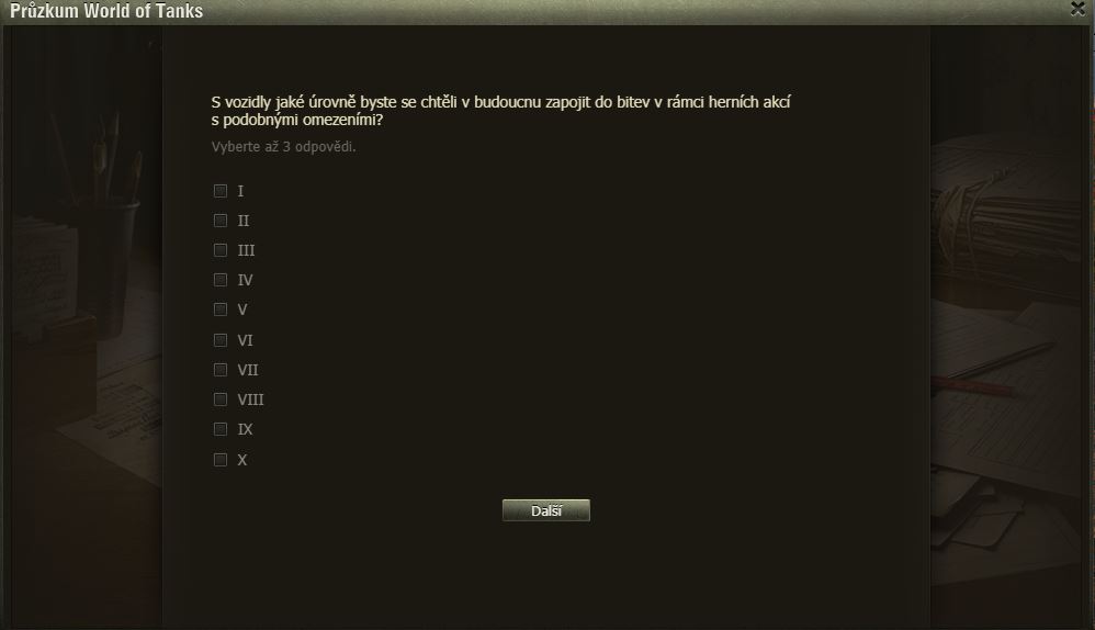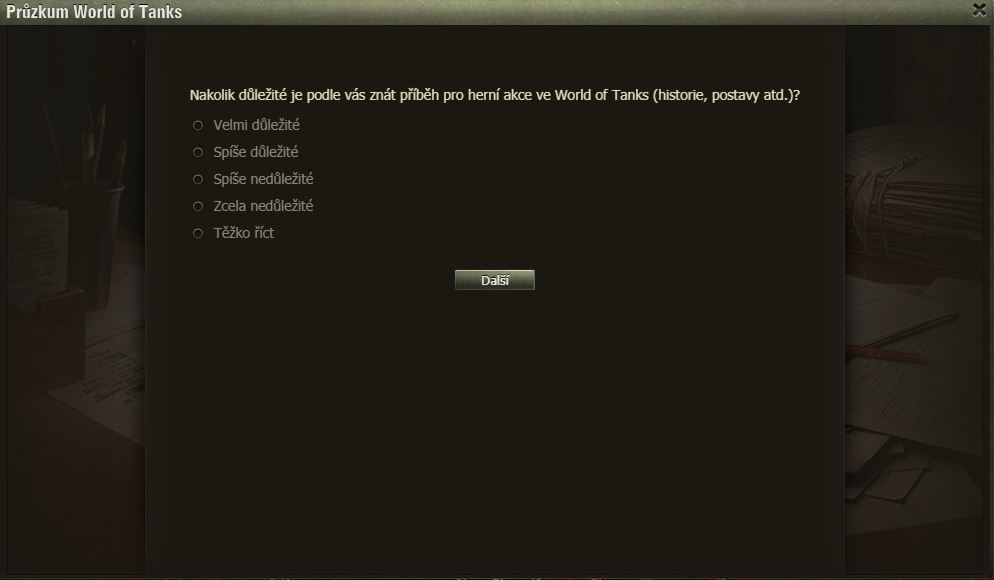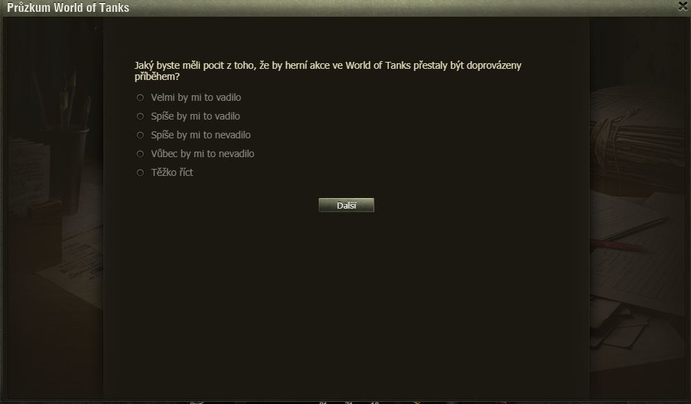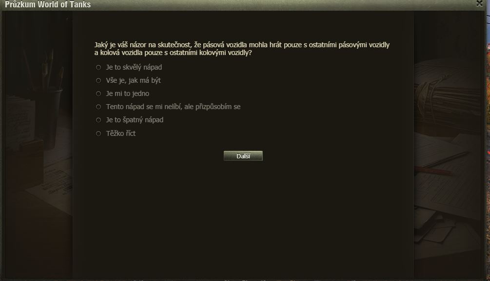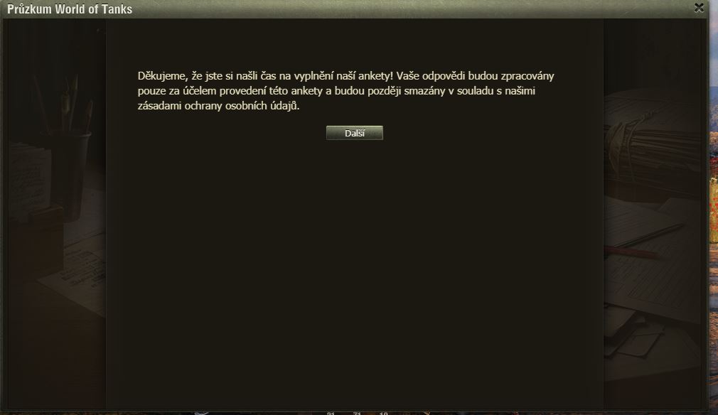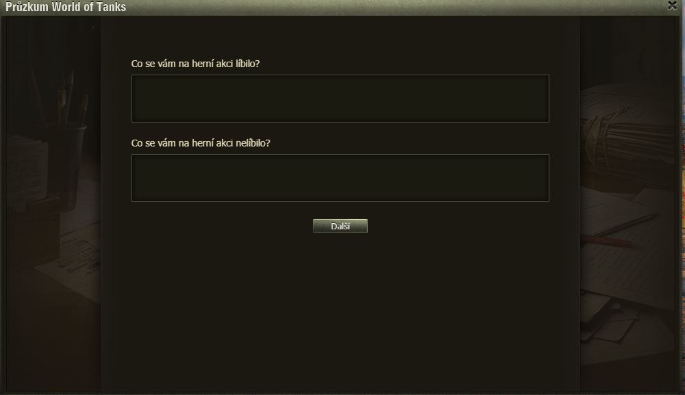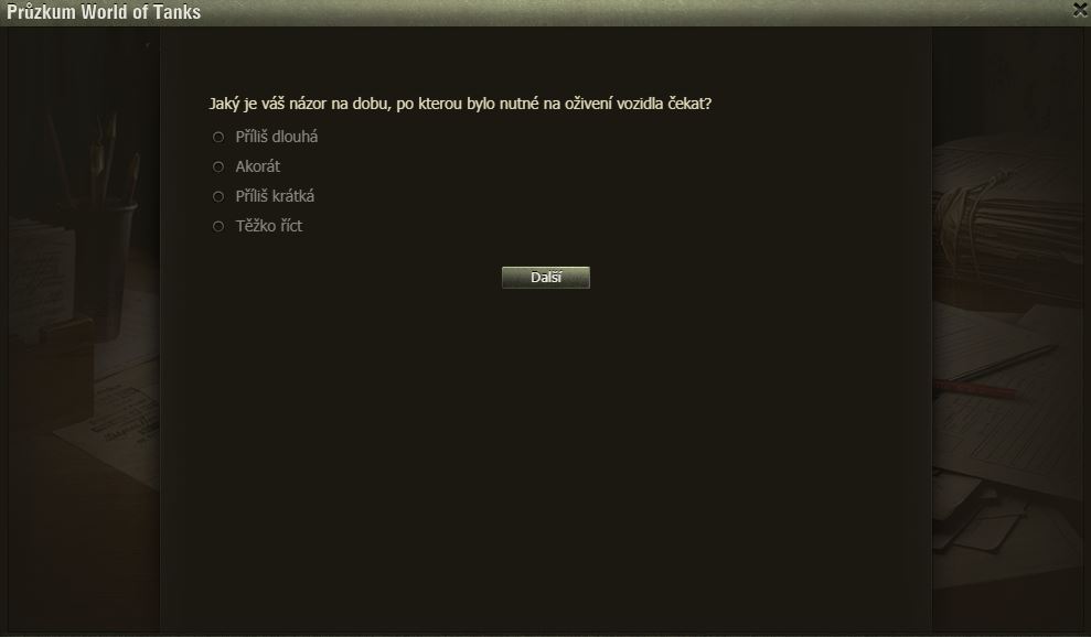 Hráli jste Dýňové slavnosti? Pak možná uvítáte dotazník WoT právě na tuto akci. Po delší době se mi ve hře objevilo okno dotazníku, poctivě jsem ho vyplnil a odeslal.