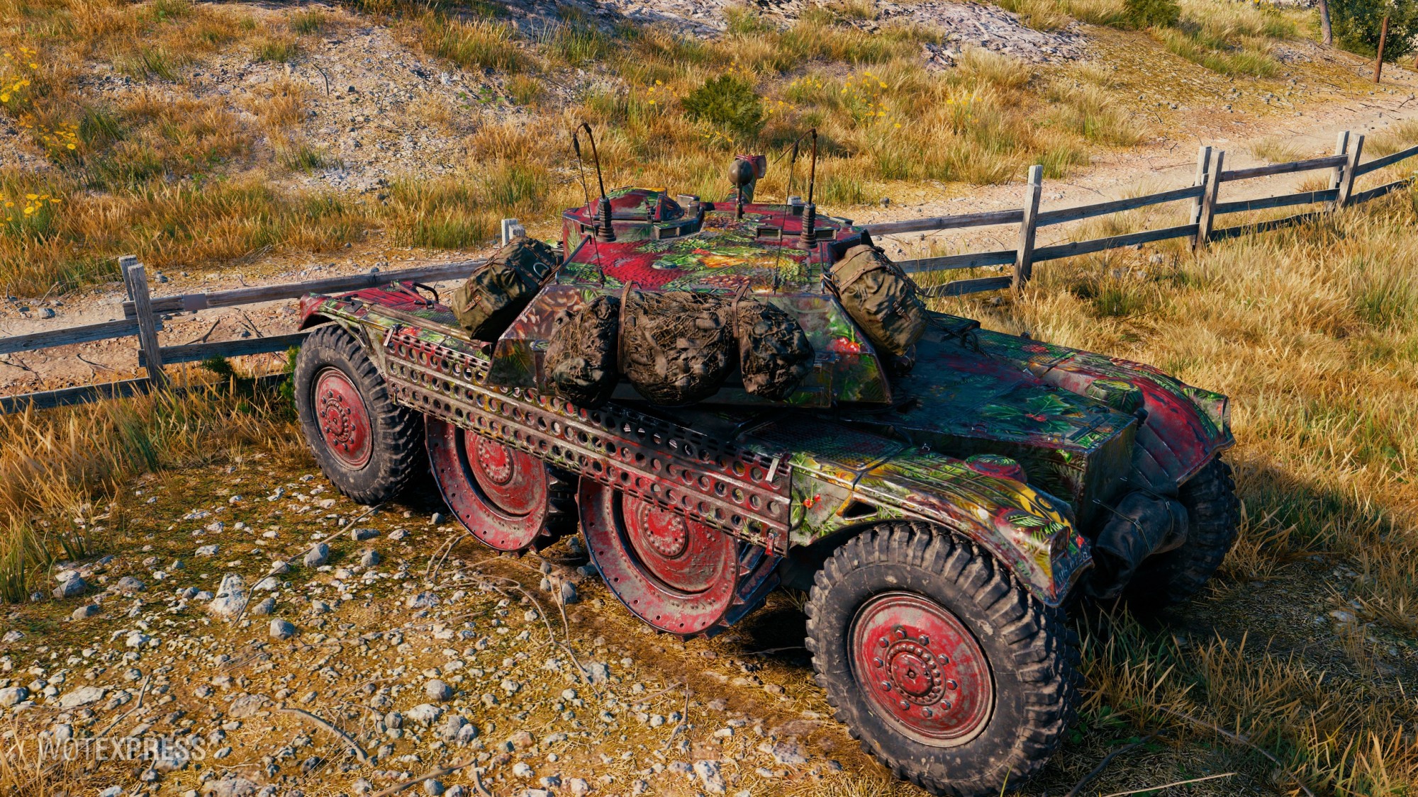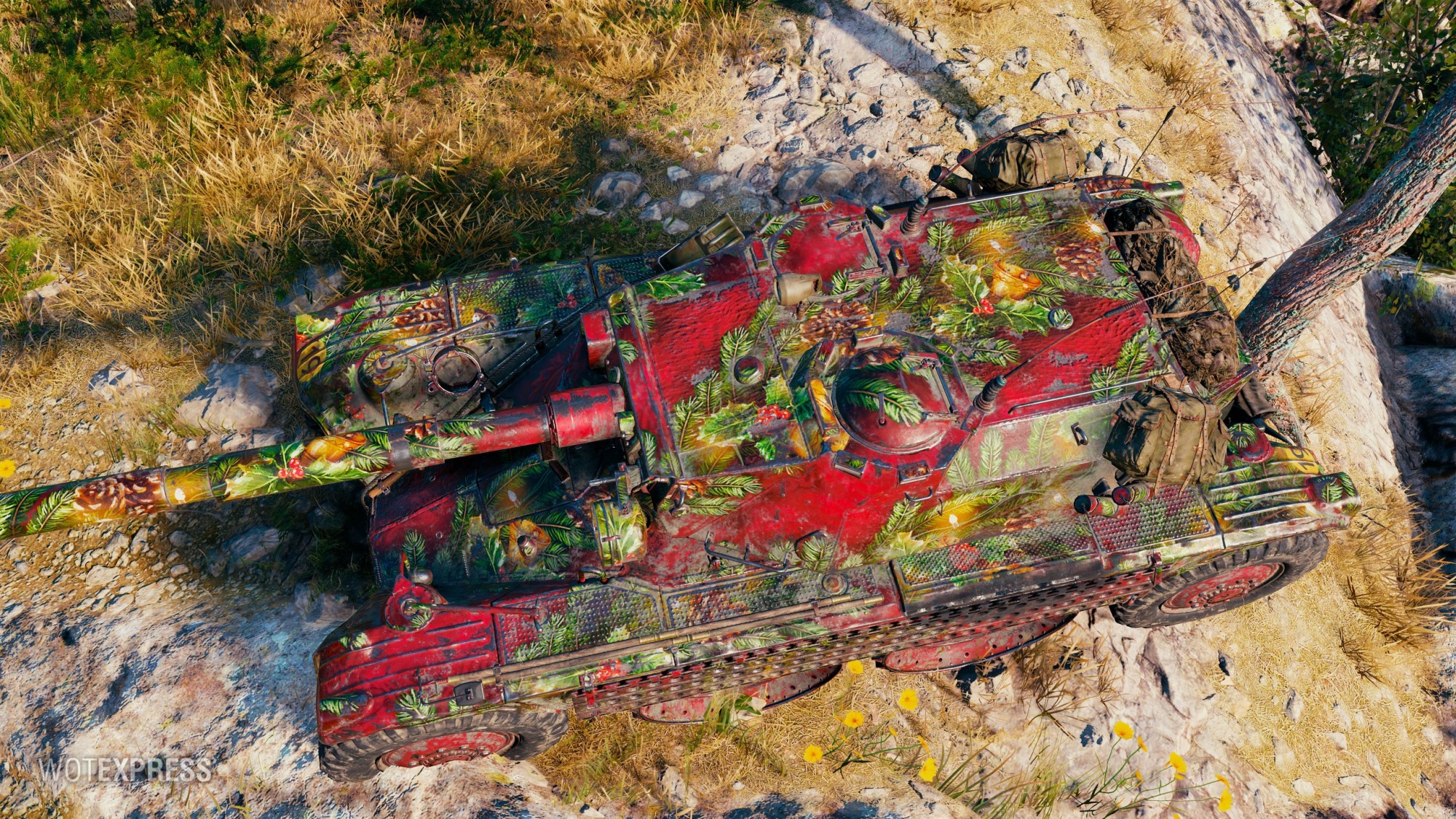 „Co můžeme říct?“ Je to snítka jehličí. Dech beroucí ozdoba inspirovaná svátky v klasických odstínech zelené a červené, skromně zdobená pěknými vánočními ozdobami. Není to perfektní dárek pro vašeho drsného, palivo požírajícího ocelového kamaráda? To jsme si mysleli. Naneste na něj tuto kamufláž a jezděte jako král.“
