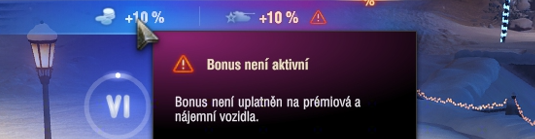 A ještě pár drobných detailů, které u vás mohou vyvolávat pochybnosti. Pokud vás stejně jako mě zarazí informace ve hře, že bonus na kredity nemůžeme uplatnit na prémiová vozidla, je to jen technická chyba hry. Bonus na kredity získáme i při hraní prémiových vozidel. Pozor: bonusy na zkušenosti nelze u prémiových vozidel využít.