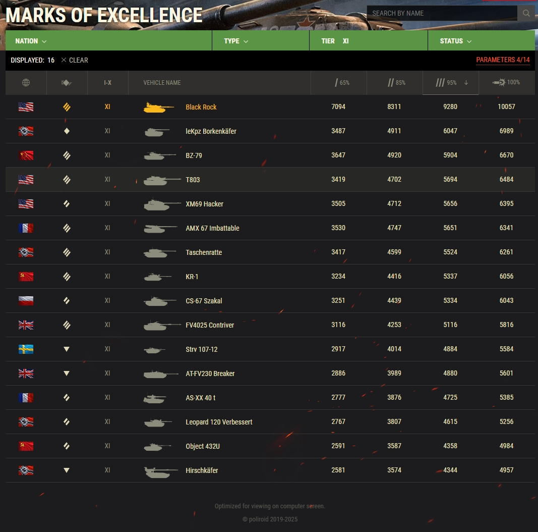 Kdo z vás už má v garáži nový tank tieru XI? Podle informací TAP alespoň jeden tank zmíněné úrovně získalo už více než 300.000 hráčů. Zároveň zveřejnili informaci, že hráči si ponejvíce vybrali Taschenratte, KR-1, T803, Leopard 120 Verbessert a Hirschkäfer. Patříte také mezi majitele těchto tanků nebo jste si vybrali nějaký jiný?